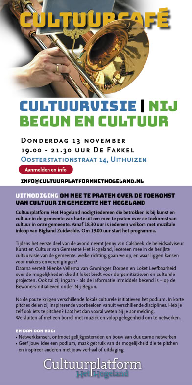 Cultuurcafé Cultuurvisie | Nij Begun en Cultuur in buurthuis De Fakkel, Muziek verzorgd door Bigband Zuidwolde. www.bigbandzuidwolde.nl